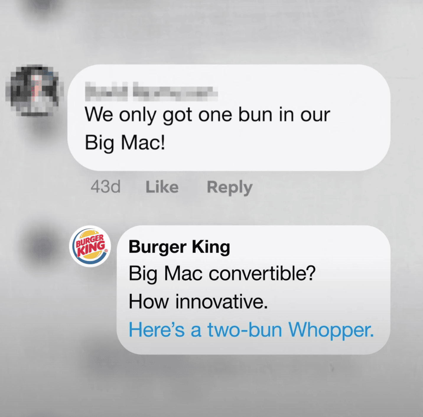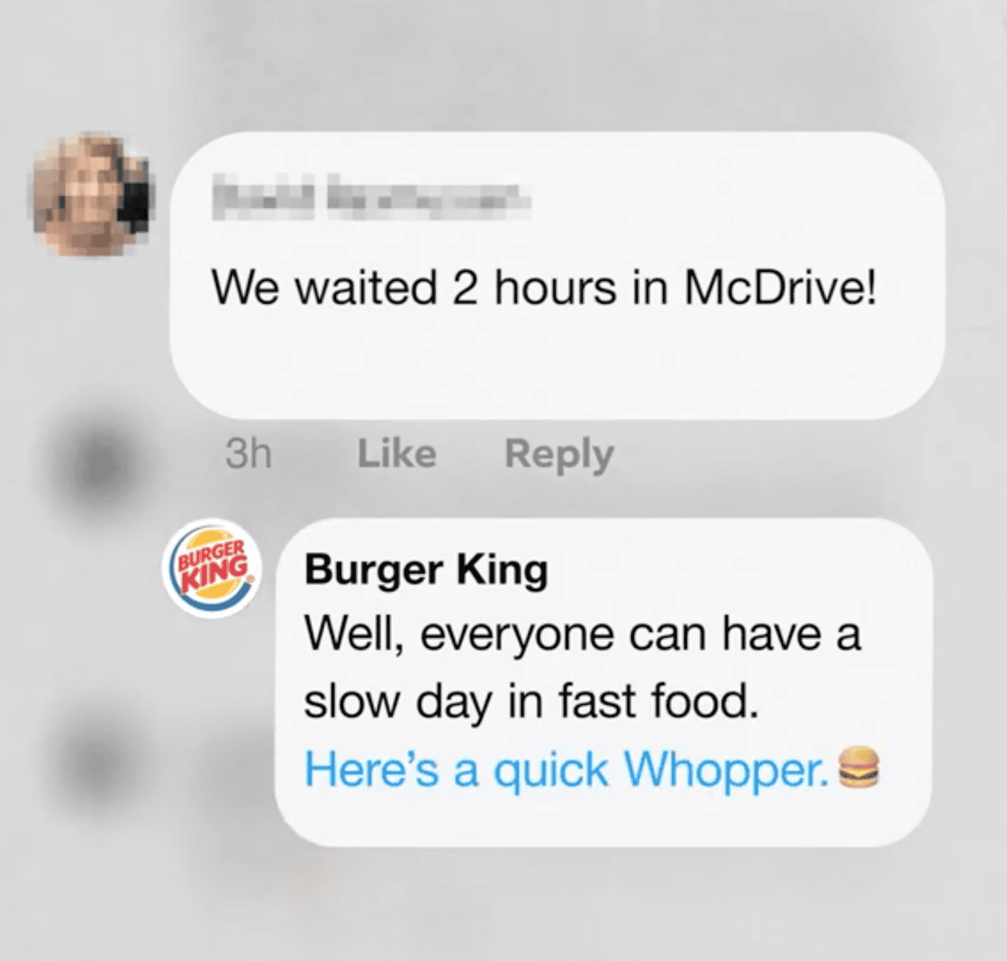 Một khách hàng phàn nàn trên trang Facebook của McDonald’s rằng họ phải chờ 2 tiếng đồng hồ mới có thức ăn đã nhận được câu trả lời từ Burger King: "Chà, ai cũng có thể trải qua một ngày chậm rãi ở cửa hàng thức ăn nhanh. Gửi bạn một chiếc Whopper siêu tốc nè."