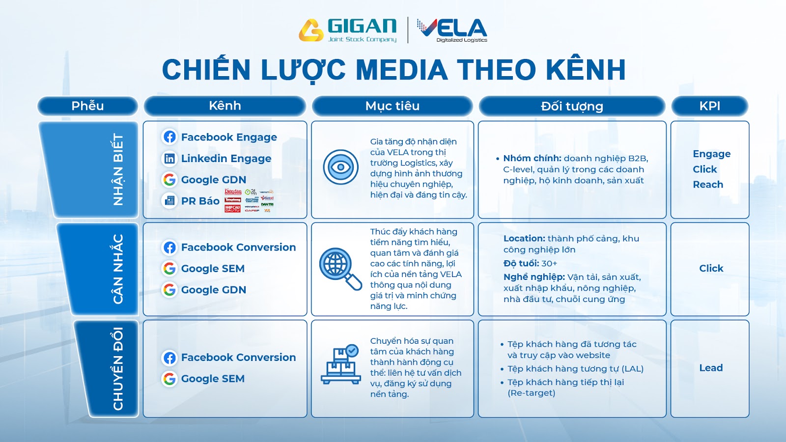 a/ Giai đoạn Nhận diện Thương hiệu: Gia tăng độ nhận diện của VELA trong thị trường Logistics, xây dựng hình ảnh thương hiệu chuyên nghiệp, hiện đại và đáng tin cậy. Đặc biệt là các thông điệp nổi bật thế mạnh ứng dụng công nghệ số trong vận hành Logistics hướng đến tối ưu hoạt động Operational Excellence (OE).