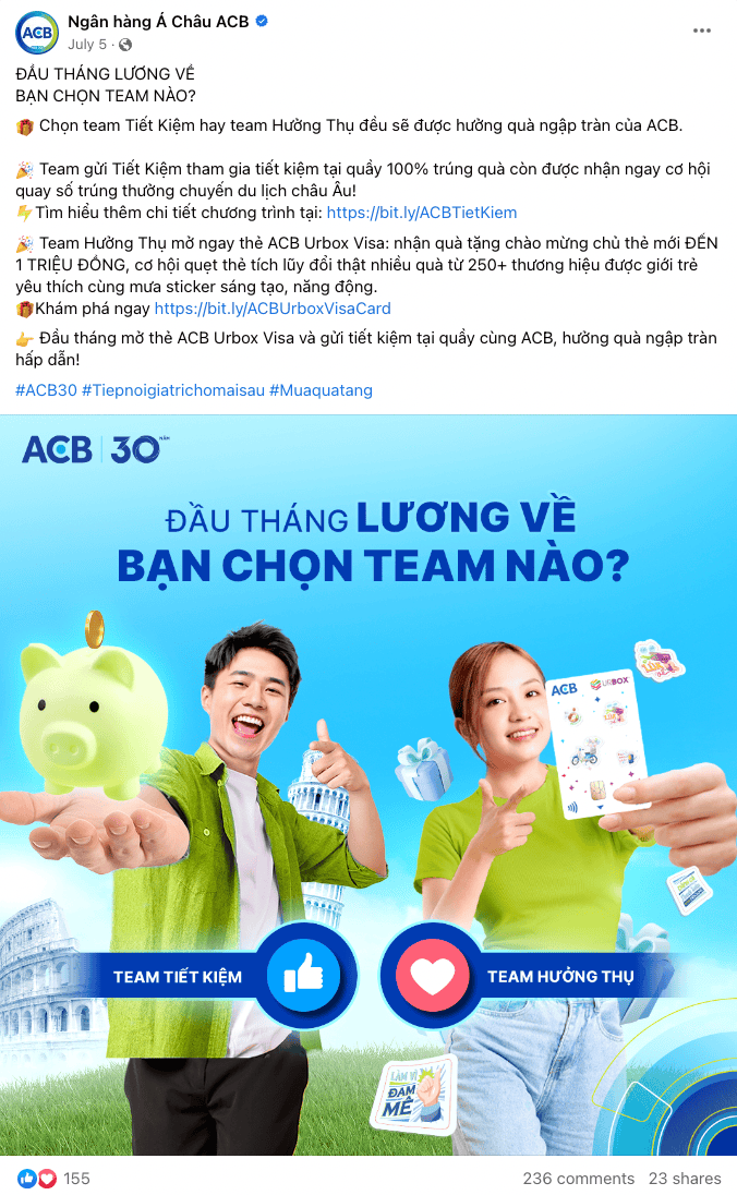 Nội dung của các bài đăng Fanpage ACB đang dần có sự đa dạng hoá, khai thác những chủ đề gần gũi và liên quan đến insight giới trẻ