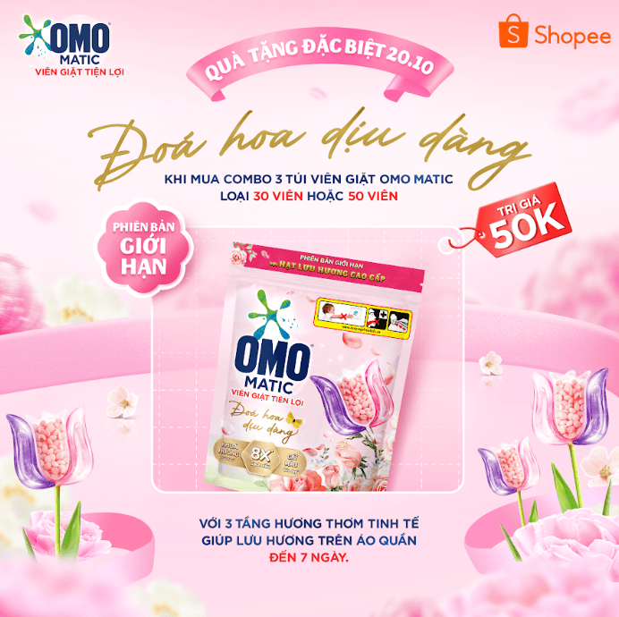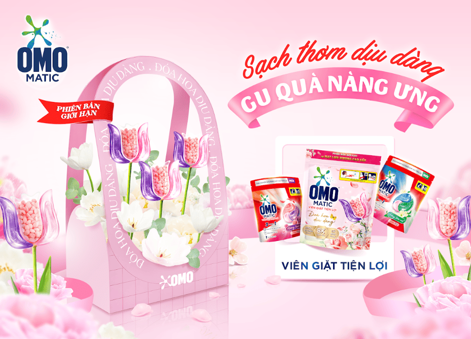 Nhân dịp ngày 20/10 - một trong những thời điểm mua sắm quan trọng trong năm, OMO mong muốn nâng tầm hình ảnh thương hiệu và tiếp tục xây dựng mối liên kết mạnh mẽ với khách hàng thông qua một món quà đặc biệt dành riêng cho phái đẹp: Viên giặt OMO Matic phiên bản giới hạn Đóa hoa dịu dàng. Đây không chỉ là sản phẩm Viên giặt thông thường, mà còn được thiết kế như một món quà độc đáo, tinh tế, đáp ứng cả về công năng lẫn giá trị thẩm mỹ.