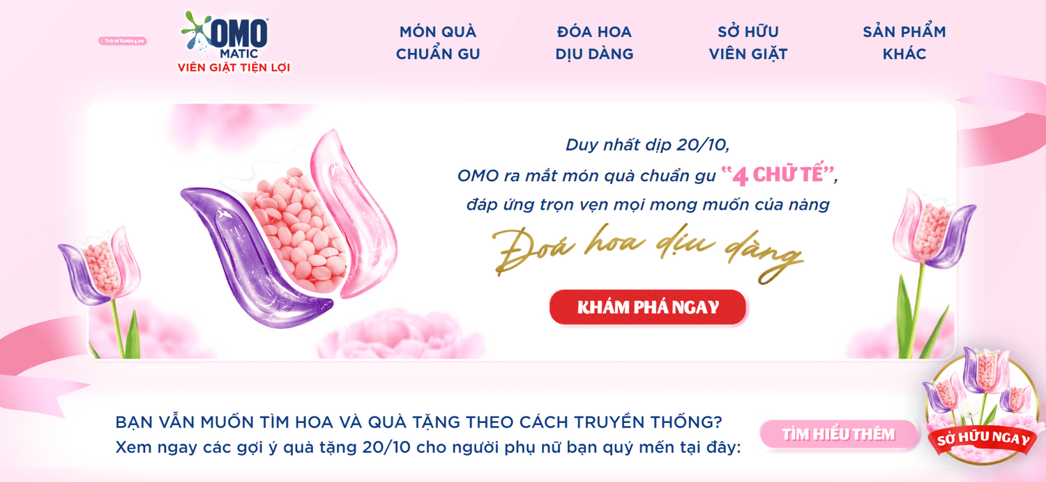 Sau khi thu hút sự chú ý của người tiêu dùng về món quà độc đáo - đóa hoa dịu dàng thơm lâu không tàn, OMO đưa họ đến Microsite của chiến dịch (omodoahoadiudang.kenh14.vn). Microsite được xây dựng với nội dung liên quan đến insights người tiêu dùng khi chỉ ra nhu cầu tìm kiếm, trao tặng món quà chuẩn gu, đúng ý người phụ nữ hiện đại. Từ đó, trang microsite cung cấp thông tin chi tiết về sản phẩm Viên giặt OMO Matic phiên bản giới hạn Đóa hoa dịu dàng chính là món quà độc đáo, chuẩn gu ‘4 chữ TẾ’, đáp ứng trọn vẹn mọi nhu cầu của phái đẹp.