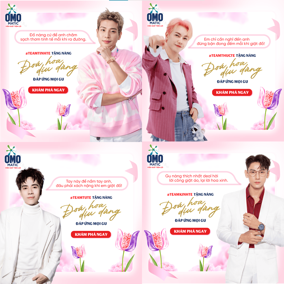 Đầu tiên, để tăng cường độ phủ sóng và nhận diện sản phẩm trên mọi phương tiện truyền thông, OMO đã gắn kết hình ảnh sản phẩm Viên giặt tiện lợi OMO Matic với 4 KOLs nổi bật từ chương trình Anh Trai Say Hi là Isaac, Quân A.P, Quang Hùng MasterD và JSOL. Họ đại diện cho từng #TeamTinhTe, #TeamThucTe, #TeamTuTe và #TeamKinhTe - 4 chữ TẾ đặc trưng của gu quà nàng ưng. Sau khi đăng tải hình ảnh của từng “anh trai” với gu quà mà họ đại diện, chiến dịch kích thích tương tác với cộng đồng thông qua bình chọn công khai (public voting) để người tiêu dùng bình chọn món quà lý tưởng cho ngày 20/10. Từ đó, OMO dẫn dắt họ đến với microsite để tìm hiểu thêm về sản phẩm Viên giặt OMO Matic phiên bản giới hạn Đóa hoa dịu dàng.