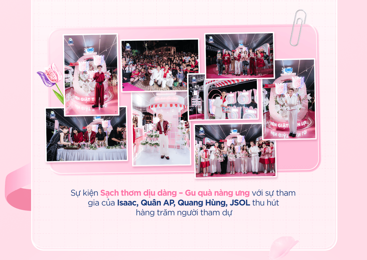 Để tạo nên những cuộc thảo luận sôi nổi và đẩy chiến dịch lên đỉnh cao, OMO mang đến sự kiện “Sạch thơm dịu dàng, gu quà nàng ưng” được tổ chức tại Crescent Mall (Quận 7). Đây là cơ hội để người tiêu dùng tương tác trực tiếp với thương hiệu, trải nghiệm sản phẩm như: chơi game cảm nhận “Siêu sức mạnh giặt giũ” từ Viên giặt tiện lợi OMO Matic 3 trong 1; tham gia workshop cắm hoa và làm thiệp handmade; check-in Tiệm hoa dịu dàng để lưu giữ những khoảnh khắc đáng nhớ và nhận quà từ Viên giặt tiện lợi OMO. Chiến dịch được xây dựng chặt chẽ từng bước về hành trình tiêu dùng từ nhận thức, tiếp nhận đến trải nghiệm sản phẩm trực tiếp, từ đó thúc đẩy chuyển đổi mua hàng, góp phần giúp Viên giặt tiện lợi OMO trở thành “Top of mind” của người tiêu dùng trong ngành hàng giặt giũ.