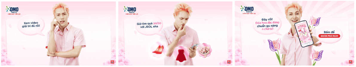 Để tiếp cận đa kênh và đảm bảo độ phủ sóng cao, OMO đã triển khai các video quảng cáo ngắn với thời lượng 6 giây và 15 giây cùng sự tham gia của 4 “anh trai” - Isaac, Quân AP, Quang Hùng MasterD và JSOL. Những video này được phát trên YouTube Ads, TikTok Ads và Meta, giúp lan tỏa thông điệp “quà tặng 20/10” một cách sinh động, gần gũi và dễ tiếp cận. Hình thức nội dung ngắn gọn nhưng ấn tượng này không chỉ giúp tăng độ nhận diện thương hiệu mà còn dẫn dắt người dùng đến microsite để khám phá thêm về sản phẩm Viên giặt OMO Matic phiên bản giới hạn Đóa hoa dịu dàng.