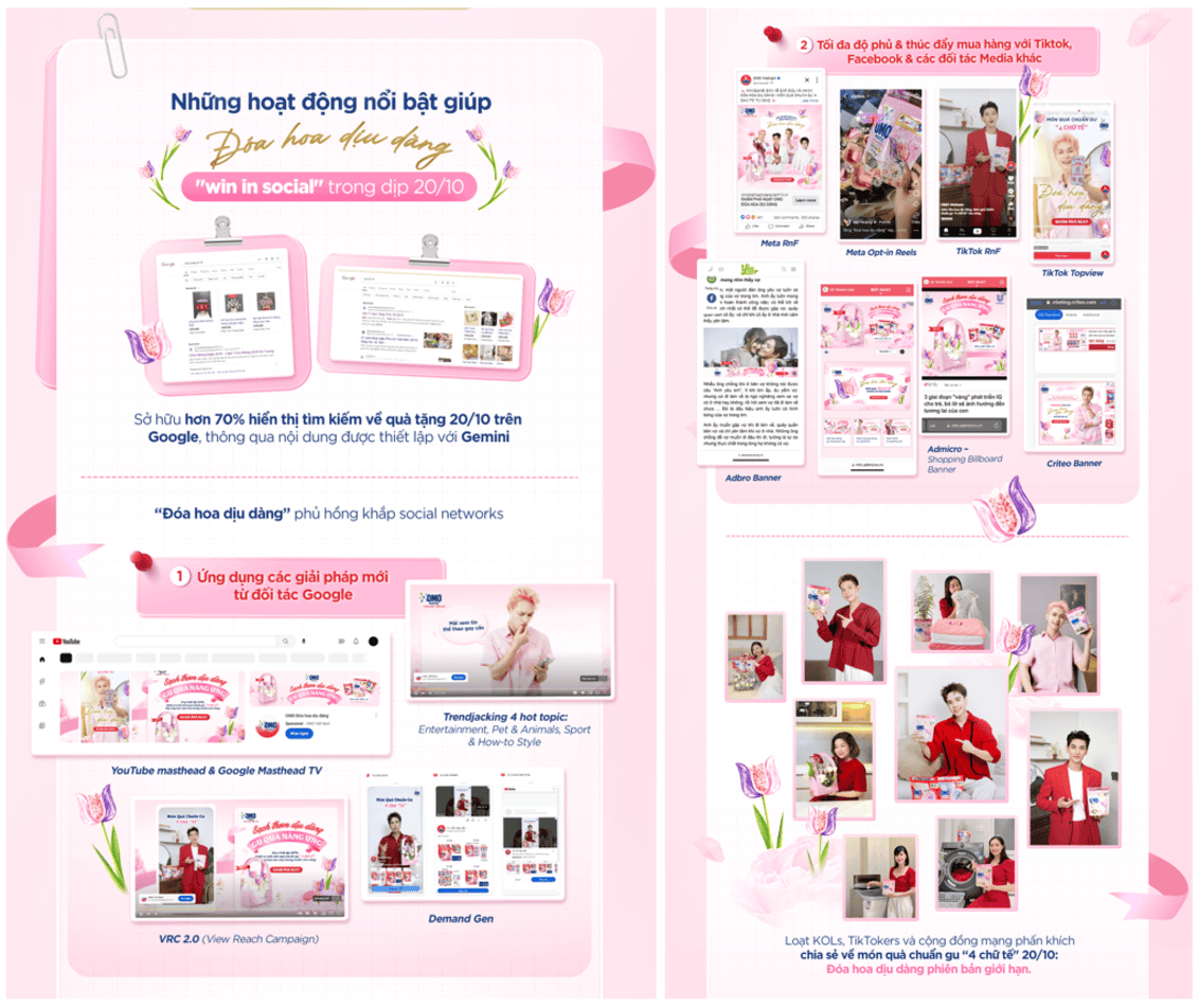 OMO đã hợp tác với Google để chiếm lĩnh nhu cầu tìm kiếm về quà tặng trên các nền tảng chính, đồng thời tối ưu hóa quảng cáo bằng AI Gemini, công cụ AI hàng đầu hiện nay của Google, giúp tạo nội dung quảng cáo theo ngữ cảnh tìm kiếm của người dùng. Khi người tiêu dùng tìm kiếm ý tưởng quà tặng hoặc lời chúc dịp 20/10, hệ thống sẽ tự động hiển thị quảng cáo phù hợp, dẫn họ đến microsite của OMO. Ngoài ra, nhờ Google Demand Gen, công cụ AI tự động hiển thị quảng cáo dựa trên hành vi và nhu cầu thực tế của người tiêu dùng, OMO đã tiếp cận đúng khách hàng mục tiêu, kích thích nhu cầu khám phá và sở hữu sản phẩm. Với chiến lược sáng tạo có công nghệ làm bệ phóng, thông điệp “Sạch thơm dịu dàng, gu quà nàng ưng” xuất hiện đúng lúc khi khách hàng có nhu cầu, mang đến trải nghiệm cá nhân hóa cao và gắn kết họ với sản phẩm Viên giặt tiện lợi OMO một cách tự nhiên. Việc sở hữu hơn 70% Share of Voice (SOV) trên Google Search cũng giúp OMO chủ động tiếp cận mọi đối tượng tìm kiếm, tạo hiệu ứng truyền thông mạnh mẽ.