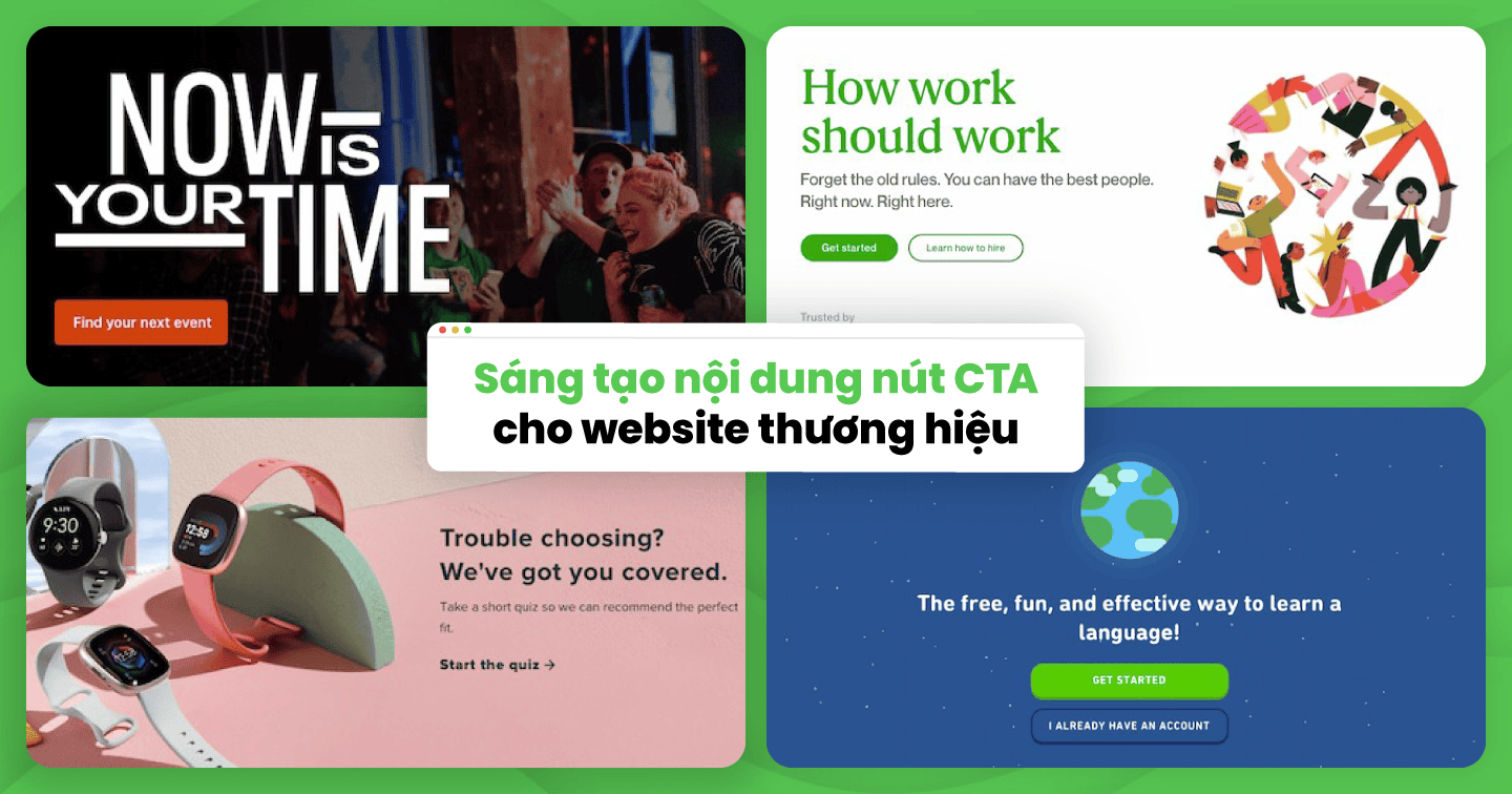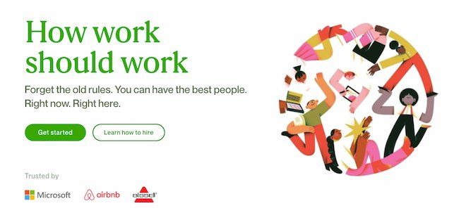 Nút CTA trên website của nền tảng tìm kiếm việc làm trực tuyến nổi tiếng Upwork bắt đầu với một thông điệp tạo động lực “How work should work. Forget the old rules. You can have the best people. Right now. Right here” (Tạm dịch: Bản chất của công việc là gì? Quên những nguyên tắc cũ đi! Bạn có thể tìm kiếm được những nhân tài ưu tú nhất ngay bây giờ và ngay trên nền tảng này).