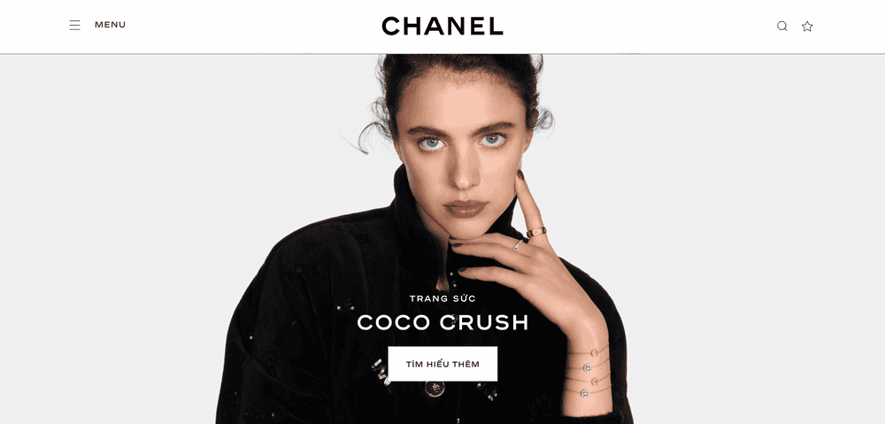 Nút CTA "Tìm hiểu thêm" được hiển thị trên trang chủ của Chanel, khuyến khích người dùng click vào để xem thông tin cụ thể của các sản phẩm thuộc bộ sưu tập