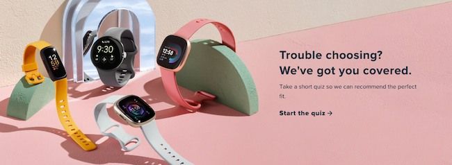 Cụ thể, nội dung trên website của thương hiệu này bắt đầu với dòng chữ “Bạn gặp khó khăn trong việc lựa chọn sản phẩm? Chúng tôi ở đây để hỗ trợ bạn”. Sau đó, Fitbit lập tức đưa ra giải pháp cho khách hàng bằng nút CTA với nội dung “Bắt đầu bài quiz”, giúp họ nhận được những gợi ý sản phẩm từ chính thương hiệu dựa trên những mong muốn và yêu cầu của mình.