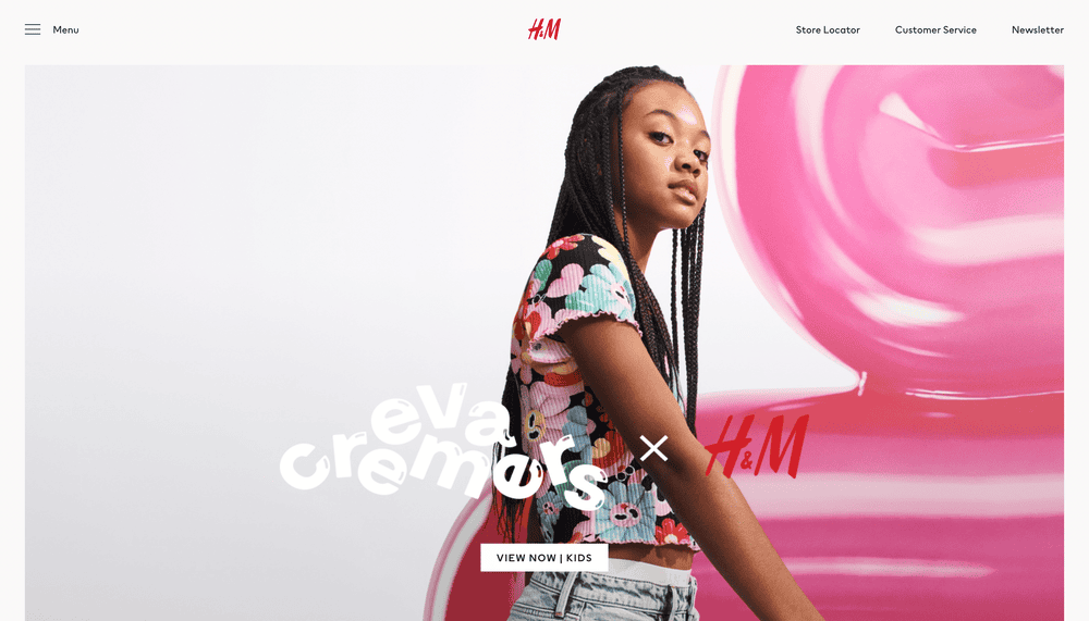 Trang chủ của H&M giới thiệu các bộ sưu tập theo mùa nhắm đến các nhóm đối tượng cụ thể như nam, nữ, thanh thiếu niên, trẻ em,...