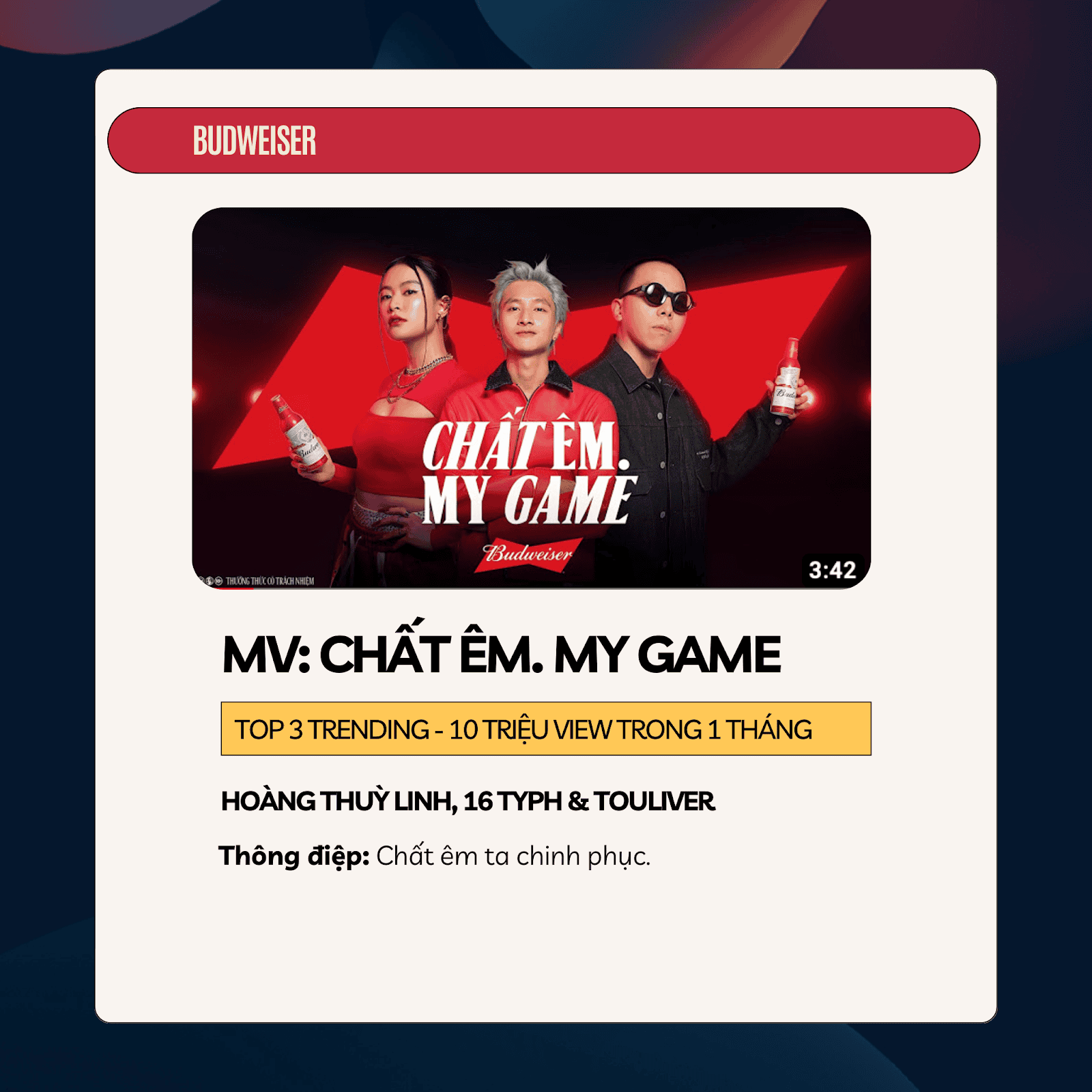 Điểm độc đáo: Sự kết hợp khéo léo độc đáo trước nay chưa từng có giữa Hoàng Thuỳ Linh, 16 Typh và Touliver đại diện cho những dòng nhạc hiện đại và truyền thống, underground và văn hoá đại chúng đã thể hiện được ‘’chất êm" của Budweiser. Giai điệu bắt tai, sôi động đã bắt trúng tần số và đến được gần hơn với thế hệ trẻ Việt Nam.