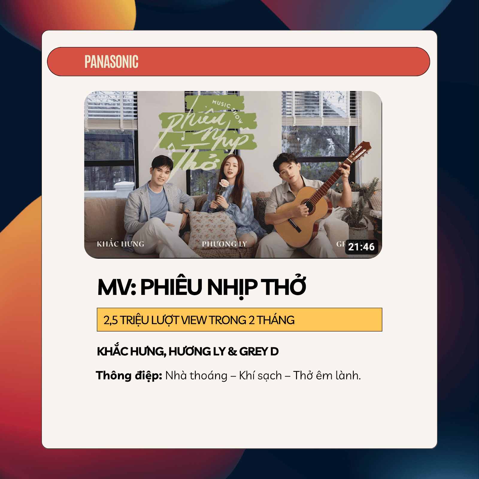 Điểm độc đáo: Tạo dựng sân khấu ngay trong nhà, mở ra không gian thân thiện, gần gũi và tiếp cận đối tượng mục tiêu. Đây là năm thứ 3 thương hiệu khai thác chủ đề ‘’dạy cách thở’’ để tạo ra sự liền mạch và đồng nhất của thông điệp, mong muốn mang đến cho người tiêu dùng cuộc sống hướng về chăm sóc sức khỏe tinh thần.