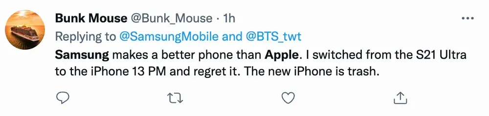Một người hâm mộ Samsung đã tweet: "Gần đây, Samsung có nhiều hoạt động hơn Apple, cộng với việc tôi đã sử dụng Android trước iPhone và vẫn thích Android hơn iOS. iOS thật là nhàm chán". Một người khác bình luận: “Samsung tạo ra một chiếc điện thoại tốt hơn Apple. Tôi đã chuyển từ S21 Ultra sang iPhone 13 PM và rất tiếc. iPhone mới là thứ rác rưởi”.