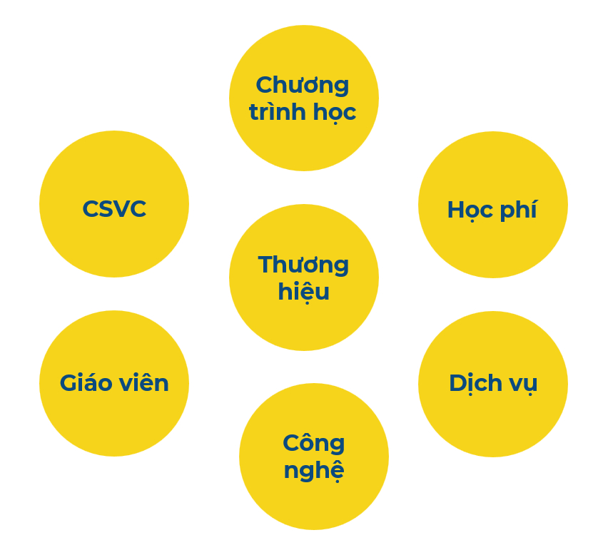 Việc xây dựng thương hiệu cho các hệ thống giáo dục hiện nay dựa trên 6 trụ cột chính, đó là (1) Triết lý giáo dục, (2) Chương trình đào tạo, (3) Cơ sở vật chất, (4) Giáo viên, (5) Dịch vụ, (6) Công nghệ.